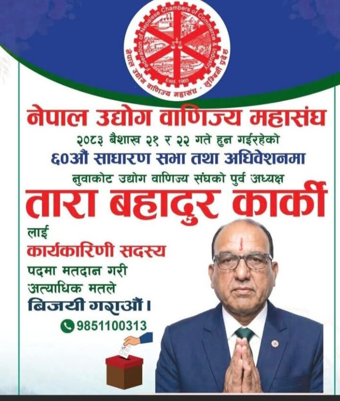 काठमाडौं । नेपाल उद्योग वाणिज्य महासंघको ५८औँ साधारण सभा तथा अधिवेशन नजिकिँदै गर्दा विभिन्न पदका लागि उम्मेदवारहरूले आफ्नो प्रचार अभियान तीव्र बनाएका छन्। यही सन्दर्भमा नुवाकोट उद्योग वाणिज्य संघका पूर्व अध्यक्ष तारा बहादुर काकींले कार्यकारिणी सदस्य पदका लागि उम्मेदवारी दिएका छन्।