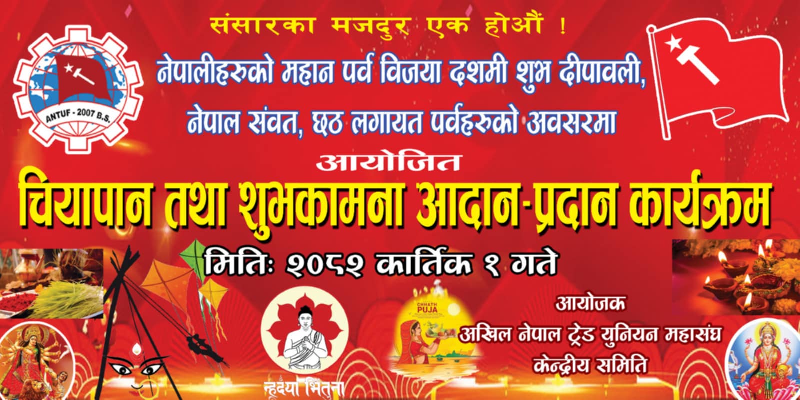 काठमाडौं, माओवादी निकट अखिल नेपाल ट्रेड यूनियन महासंघ ले २०८२ कार्तिक १ गते शनिबार चियापान तथा शुभकामना आदान–प्रदान कार्यक्रम आयोजना गर्ने भएको छ