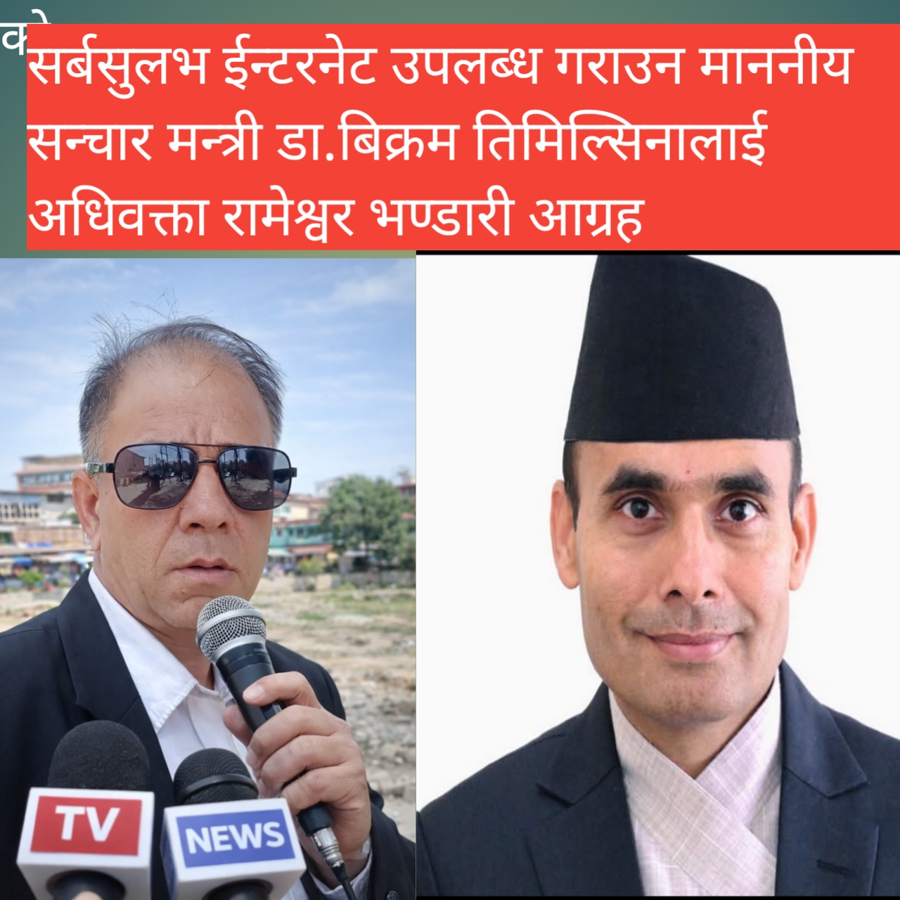 काठमाडौं — नेपाल सरकारका सञ्चार तथा सूचना प्रविधि मन्त्री डा. बिक्रम तिमिल्सिनालाई इन्टरनेट सेवा सर्वसुलभ, सस्तो र गुणस्तरीय बनाउन अधिवक्ता रामेश्वर भण्डारीले आग्रह गरेका छन्।